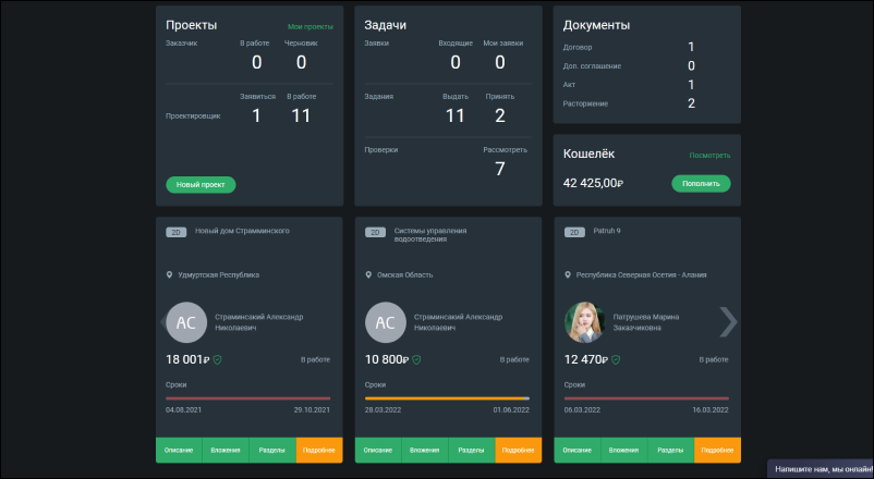 - Блок «Проекты» - информация о созданных вами проектах или проектах, на которые вы можете заявиться в качестве ГИПа или Проектировщика по вашей специализации.