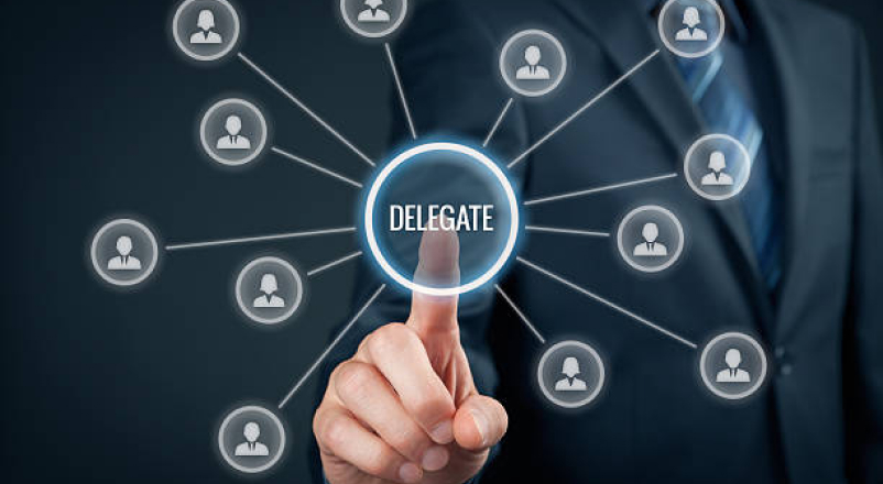 Делегирование прав происходит при публикации задачи, путем активации чек-бокса "Замещение прав доступа по разделу", делегирует права по разделу исполнителю задачи.